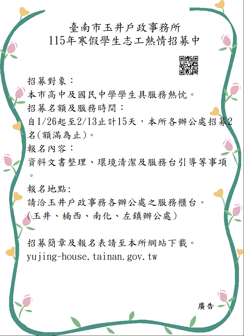 目的:為使學生建立關懷社會、服務他人之人生觀,於寒假期間 推廣學生參與戶政志願服務。 主辦單位:臺南市玉井戶政事務所。 招募對象:臺南市高中及國民中學學生。 服務內容: 檔案文件整理及清查。 服務台引導。 環境清潔整理。 協助各項政令 ...更多